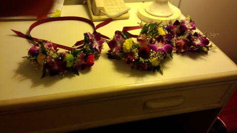 | フェスティバルの為に作った髪飾り(小さいのはラカ・ヘイアウにささげる為に作った物)翌日ヘイアウで今回の踊りを奉納しました。 | |||