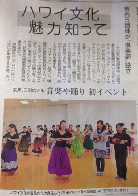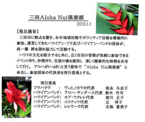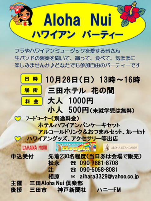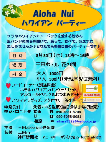 昨年より計画していた倶楽部が発足しました。 Aloha Nuiとはアロハが一杯と言う意味です。 みんな仲良く参加出来るイベントを企画して 行きたいと思っています。 企画する側も参加費を支払い 全員が参加 者です。これからもっと参加団体が増えて輪が 広がっていくことを望んでいます。 今回は第1回目のイベントとして 3月29日(火)13:00~16:00 三田ホテル花の間 にて 三田Aloha Nuiハワイアンパーティを 企画しています。詳細は別途チラシにてお知 らせしております。 |