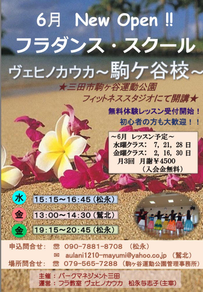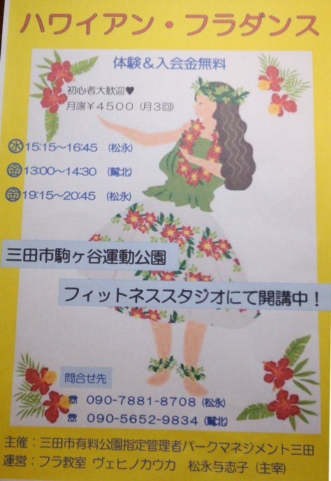 今年も駒ヶ谷運動公園にて三田市指定事業者 による様々なスポーツ、ダンス等のステージ観覧 や教室体験の出来るイベントが行われます。 Wehi No Ka Ukaフラ教室の生徒さん達に よるフラ・ステージは(体育館前を通り過ぎて野球場 前の公園)にて11時30分より約35分間の予定 です。そしてフラ体験教室は体育館内の広い フィットネススタジオにて13時30分~14時30分 です。初心者の方どなたでも自由参加で無料です。 秋の1日、コマスポ・やるスポで楽しみましょう!! |