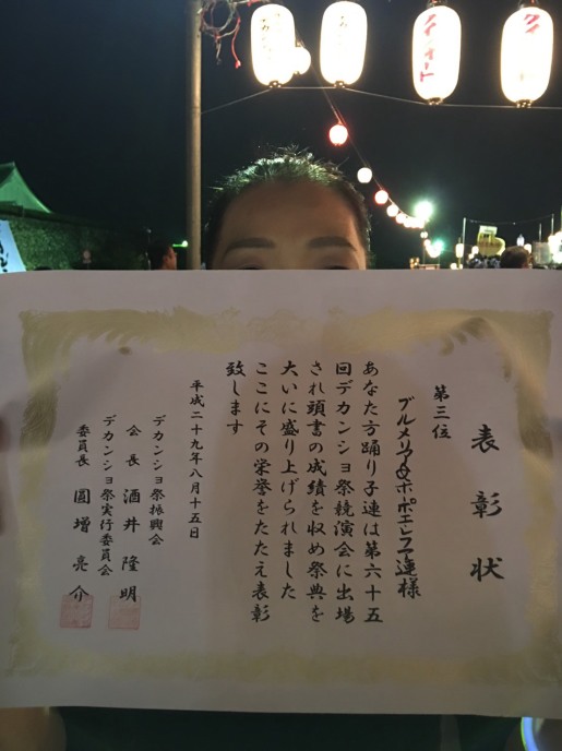 | 8月15日篠山デカンショ祭り 篠山クラスのホーポエとプルメリアが フラの衣装で踊りに参加して 見事入賞しました!! |