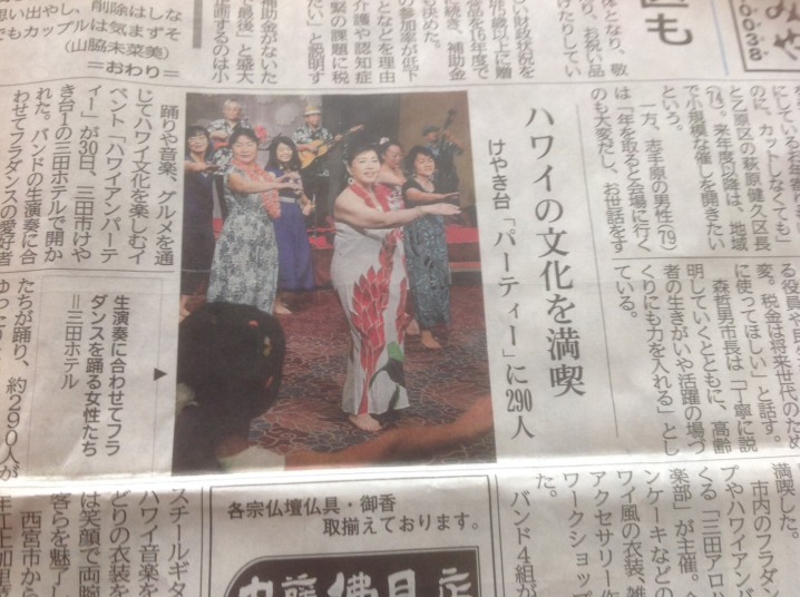 | 8月30日(水) アロハヌイ・ハワイアンパーティ 昨年を上回る大勢の方にお越し頂き 花の間もホワイエも沢山の人で賑いました。 最初にお食事スペースに集中した為に混乱 しましたが、次回の課題にしたいと思います。 Band演奏が進むにつれ、ダンスを楽しむ人 が増えフラショップエリアでのお買い物も楽し まれて、順調にパーティを進行する事が出来 ました。 新聞にパーティの様子が掲載されました。 |