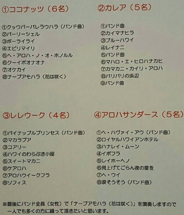 2018年10月28日(日) ALOHA NUIハワイアンパーティ 出演順バンド演奏曲目 4Bandの曲名と順番が決まりました。 踊りたい曲をチェックして、合間にお食事や お買い物を楽しんで下さいネ。 💛 小さなお子さんにも出来るアクセサリー 作りもあります。 吹矢体験も有るかも!? |