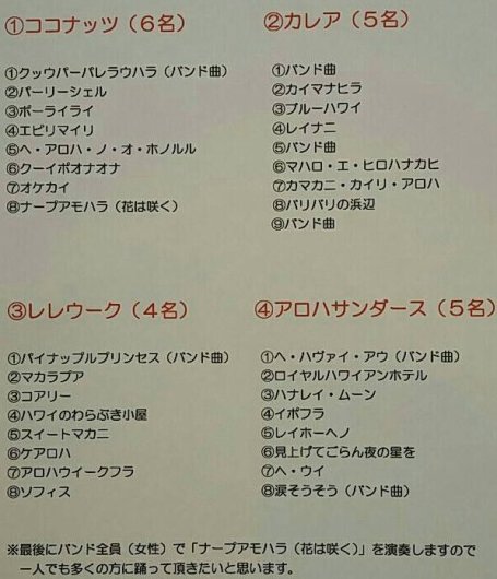 Aloha Nuiハワイアンパーティ Band曲が変更になりました。 ☝ここをクリックして下さい。 曲順プログラムが出ます。 踊れる曲はどんどん踊って楽しんで下さい😊 日時:2017年8月30日(水)13時から 会場:三田ホテル(12時半開場) |