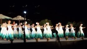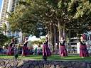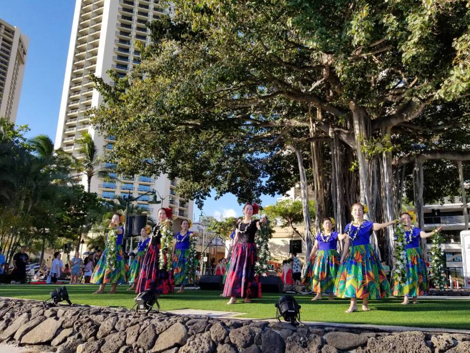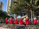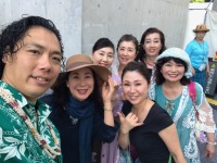 | 教室の生徒さん有志 合計23名で参加して来ました。 毎日快晴で、海も空も花も、そして私達も輝いていました! 初日はカピオラニ公園でランチして、次の日からのステージ に向けて、海を見ながらリハーサルをしました。 7日(金)はアラモアナセンターステージで4曲、夕方からは ワイキキ・カーニバル/ブロックパーティーで3曲踊りました。 |