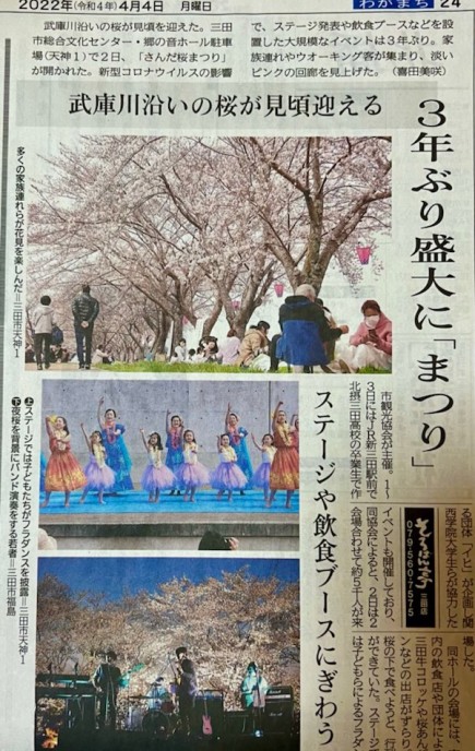 | 2022年4月2日(土) さんだ桜まつり 桜が満開に咲く土曜日、とても爽やかな晴天に 恵まれ、久しぶりにステージ発表が有り 多くの家族連れでにぎわいました。 市観光協会の依頼でヴェヒノカウカが フラダンスを披露させて頂きました。 |