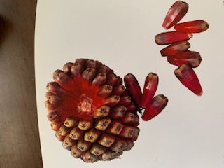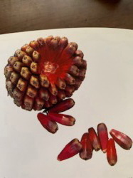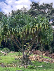 お盆休みも自粛してどこへも出かけないので ハワイアンソングによく出て来るHala(ハラ) について紹介します。 2020年8月16日 ☆Halaはハワイ自生種とみられており、9mほど の高さの小木に成長します。低地に見られ大抵 湿った海岸線等に自生します 雄株と雌株があり、それぞれが花を咲かせます。 ☆Hinano(ヒーナノ)はハラの雄株に咲く花のこと。 白い小さな花はとても香りがよく、昔は花婿が 結婚初夜に持参したと言われています。 ☆雌株には細長い球状をした集合果がなります。 集合果には様々な色の種類が有り、1つ1つの 果実には種子が含まれています。熟すと甘酸っ ぱいパイナップルとオレンジを合わせたような 良い香りがしますよ。 レイには熟す前に摘み取り、1つ1つの実を糸で 繋ぎます。落ちて乾いた実は、カパ(樹皮布)や 生地に模様を描くブラシとして使います。 ☆私はクムPoni Kamauuとの儀式の際に、 クムに頂いた布に 同じくクムに用意して頂いた ククイ・オイルに黒い灰を混ぜて、ハラの実の ブラシを使ってキヘイ(儀式の際肩にかける布) に海と山の模様を描きました。 ☆Halaの葉は両サイドの痛いギザギザを取り、 適当な幅に切り、編んで帽子やマットなど さまざまな作品になります。 |