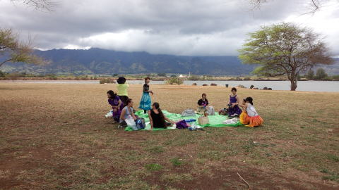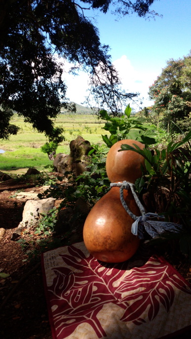 2017年4月ハワイレッスン ・久しぶりにウルポ・ヘイアウに行き、今まで習った カヒコの 復習をしました。ウルポの大地にイプへケの 音が伝わり 感動しました。 そして黄色くなって大地に落ちたククイの葉を1枚づつ 皆でつなぎ 1つのレイにします。 |