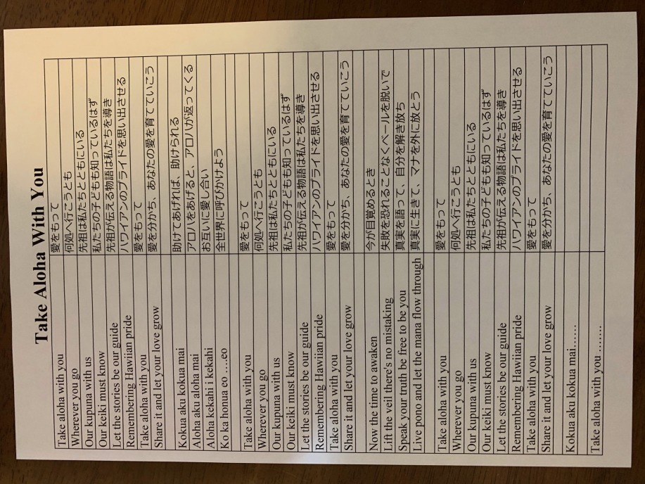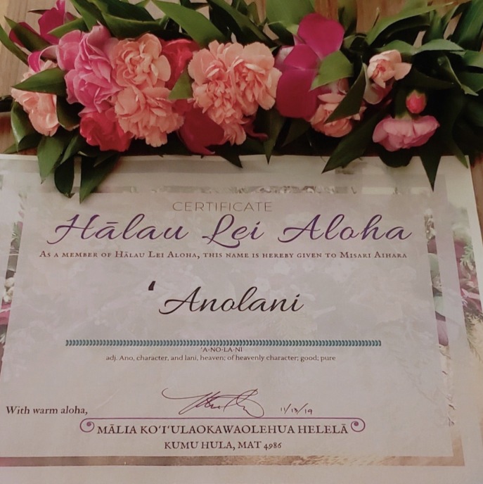 | 2019年11月13日 相原がハワイのクム「マリア・へレラ」よりハワイアンネーム を授かりました。 以前よりクムのレッスンを受講して いましたが、今回正式に師弟関係を結び ”Anolani”という ハワイアンネームを頂きました。 天から降りて来る いろいろなサインを感じ取って、それを 自分のフラに生かしていくという意味でです。 これから年に数回ハワイにて教えを受けていきます。 |