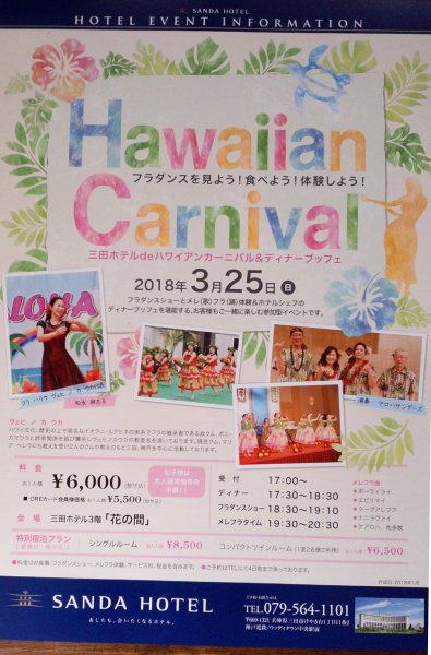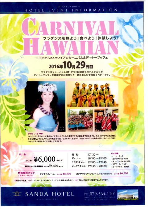 今年も三田Hotelハワイアン・カーニバルに ヴェヒノカウカが出演します。 ホテルのビュッフェを堪能した後は 1部:フラとバンドのショー 2部:全てメレフラタイム バンドの生演奏で自由に踊って下さい。 開場までに来られた方には整理券をご用意 する予定です。 ホワイエにショップも並びますので手作り 体験したり、お買い物も楽しんで頂けます。 ぜひ皆様 お越し下さい。 前売りはハラウ割引も有ります。 お問合せ下さい。 (090-7881-8708 松永) ![]() 三田Hotelのホームページにも掲載されています。 |