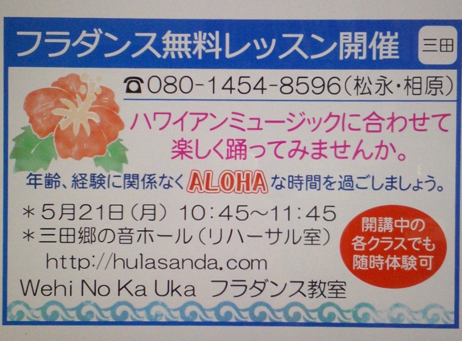 フラサークル イリマ 6月から新規サークルのレッスンがスタート します! ・第1、第3金曜日(月2回) 13:30~ ・けやき台コミュ二ティハウス集会室 随時体験無料です。入会金無料 楽しいフラ始めましょう。 ・講師連絡先:090-8466-9738 サトウ |