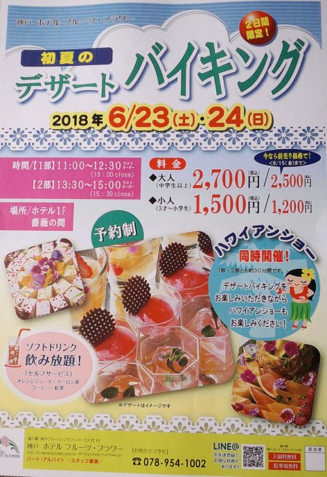 | ~お知らせ~ 「神戸ホテル フルーツ・フラワー」 デザート・バイキングでフラ・ショー 6月23日(土)、24日(日) 【時間】 1部 11:00~12:30 ※フラショーは11:30~12:00 2部 13:30~15:0.0 ※フラショーは14:00~14:30 1部と2部は入れ替え制です 【場所】ホテル2階 蘭の間に変更 ヴェヒノカウカのメンバーがフラ・ショーに 出演します。 ぜひ お越し下さいネ 前売りは6月15日までです。 |