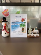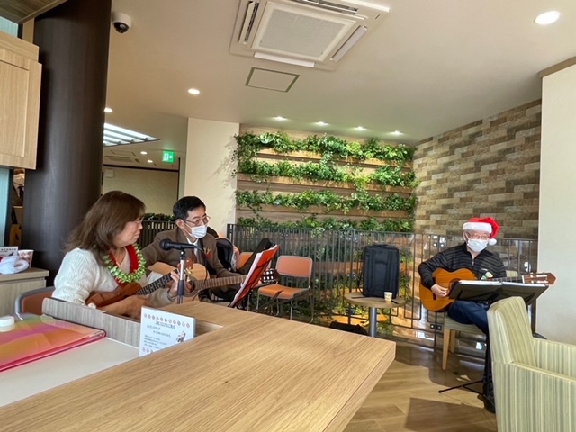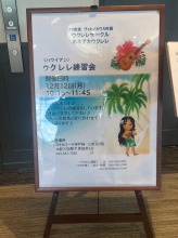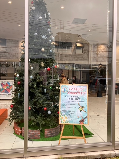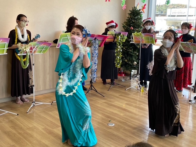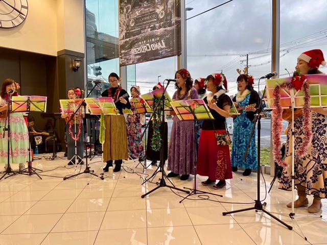 | 去年もXmasの時期にウクレレ練習会をさせて頂いたのですが、今年は店長さんからお誘いを頂き 1Fの広くて綺麗なショウルームで、ウクレレとフラの Liveをさせて頂きました。店内に沢山椅子を並べて 頂いて大盛況でした。 |
