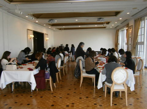 2016年1月28日(木) 三田ホテル星の間 3回目のリボンレイ講習会が順調に終わり ました。 この日は27名参加でおしゃべりも はずみ、手も進み?後半追い上げて何とか セーフ!! 短時間で仕上げるのは大変だけれど、出来 上がった時の充実感がありますね。 |