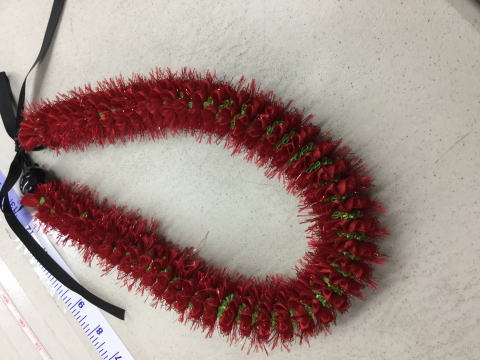 ハワイにいらっしゃる講師の先生から今回教えて 頂けるレイのサンプル写真が送られて来ました。 レフアをイメージして赤と緑を使用したいとお願いして いました。とても素敵です。 何度かデザインの打合せをして頂き、今回は初めてなので 誰もが1回で最初から最後まで仕上げられるようにと 配慮して下さいました。材料もハワイから買ってきて下さる そうです。楽しみ(^^♪ リボンレイが誕生したのは、1994年頃だそうです。 レイ作りの為に一気に花を摘んでしまうと、せっかくの 綺麗な花が無くなってしまいます。 カジメロさんが自然保護の運動をしていた頃です。 リボンレイは花を愛する心から生まれました。 2015.11.21 |