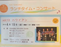 | ランチタイム・コンサート 郷の音ホールのアクトスクエアにて(約60分) 河田信秀さんとMAHANA Soundsによる ハワイアン・ライブが有ります。 ヴェヒノカウカのメンバーもフラで出演します。 応援よろしく!! 入場料:一般800円 Sato-Netくらぶ500円 全席自由 未就学児はご遠慮下さい。 🌺 🌺 🌺 |