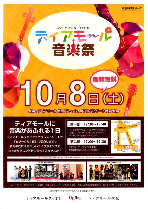 | ”ディアモール アニバーサリー・フェスタ2017” 日時;10月7日(土)14:00~15:00 (14:00~14:30 Wehi No Ka Ukaフラ・ショー) (14:30~15:00 ミニ・ワーク) 会場;ディアモール大阪 ファッショナブル・ストリート特設会場 他にも ・有名Band演奏 ・美に関するワークショップ等の催し有り ・秋の1日をぜひ大阪ディアモールへ お越しください。 |
